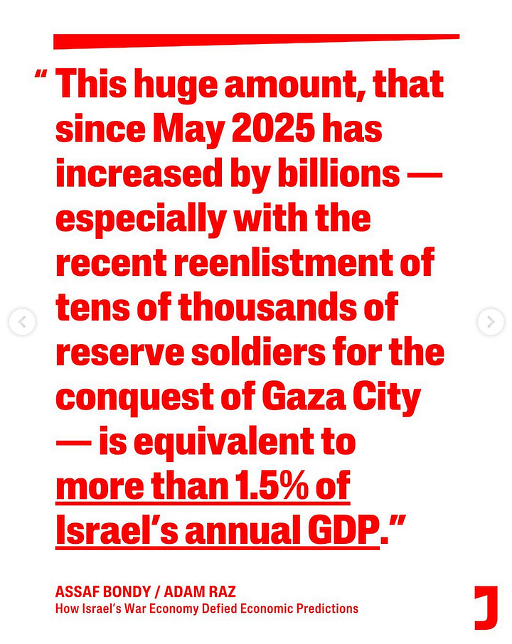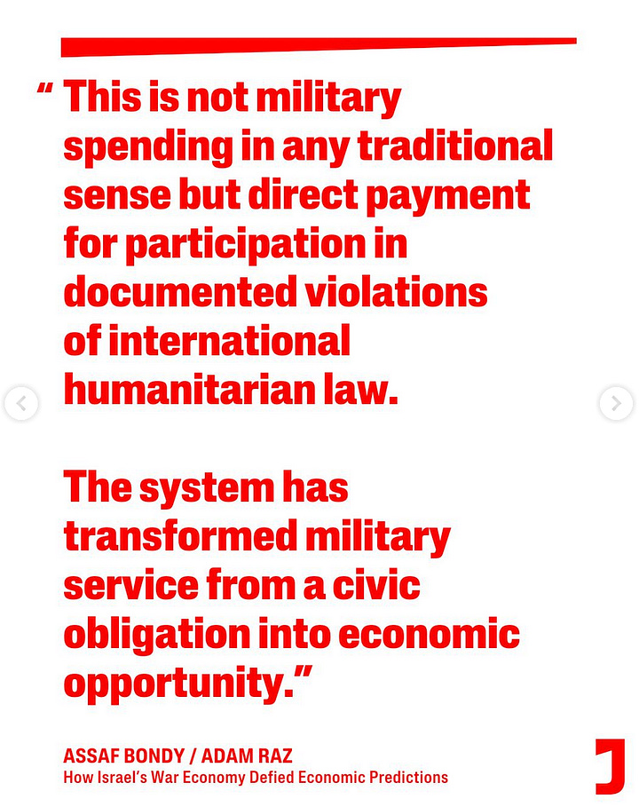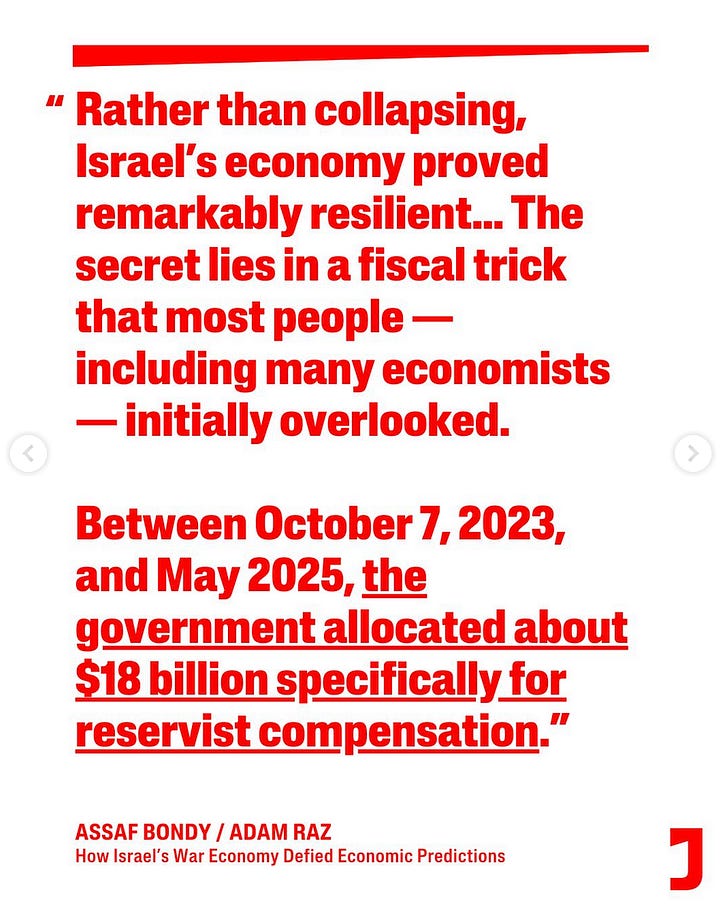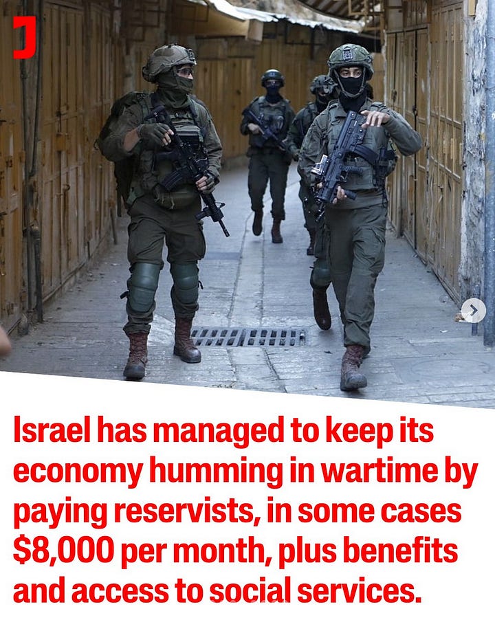 Mi-a apărut pe Instagram un articol din Jacobin despre cum a reușit Israelul să evite o criză economică în plin război plătind rezerviștii cu dublul față de salariul mediu adică $8.000/lună și oferindu-le servicii publice pe gratis.