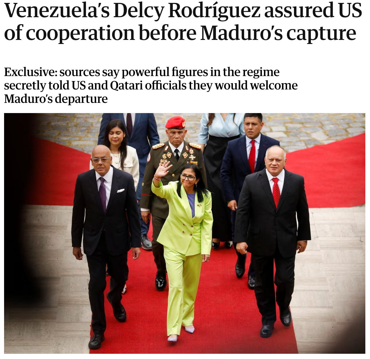 Însă nu am scris nimic atunci, pentru că nu aveam dovezi. Și nici nu am contacte sus puse prin Venezuela sau SUA să aflu ceva. Dar văzui pe The Guardian că jurnaliștii lor au primit confirmarea de la surse sus-puse că Delcy Rodriguez, vice-președinta Venezuelei a vorbit cu SUA înainte să-l răpească pe Maduro și i-a asigurat de cooperarea ei. La fel a făcut și Diosdado Cabello, ministrul de interne.